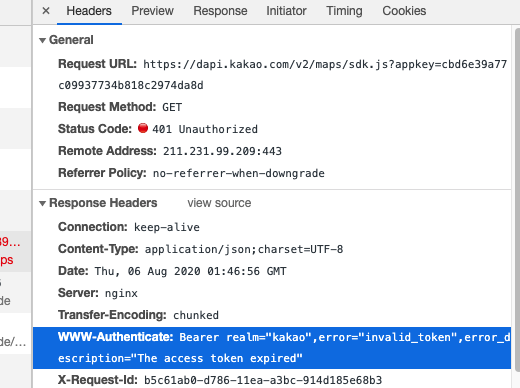 카카오맵 지도 API 오류, 401 Unauthorized , Bearer realm="kakao",error="invalid_token",error_description="The access token expired