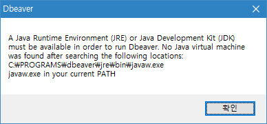 dbeaver실행하다가 다음과 같은 오류가 나면 자바를 못찾아서 발생하는 오류 입니다.