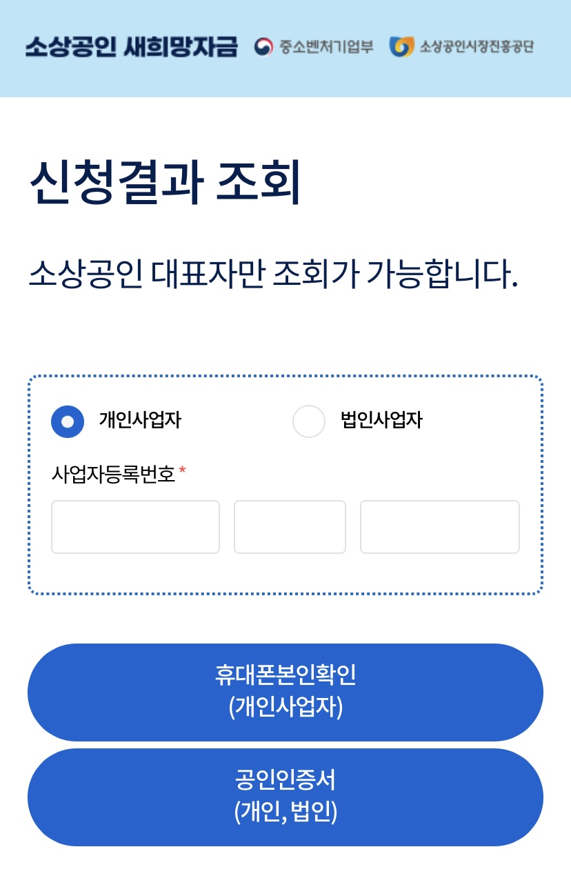 사업자정보 입력하고 핸드폰 인증을 완료하면 신청할 수 있습니다.