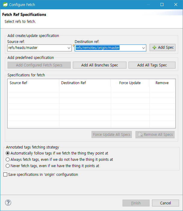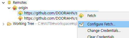 프로젝트 > Remotes > origin > 패치주소에 마우스오른쪽 > Configure Fetch...