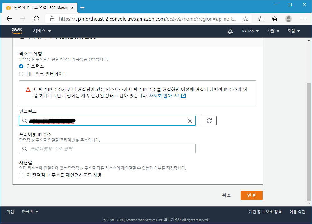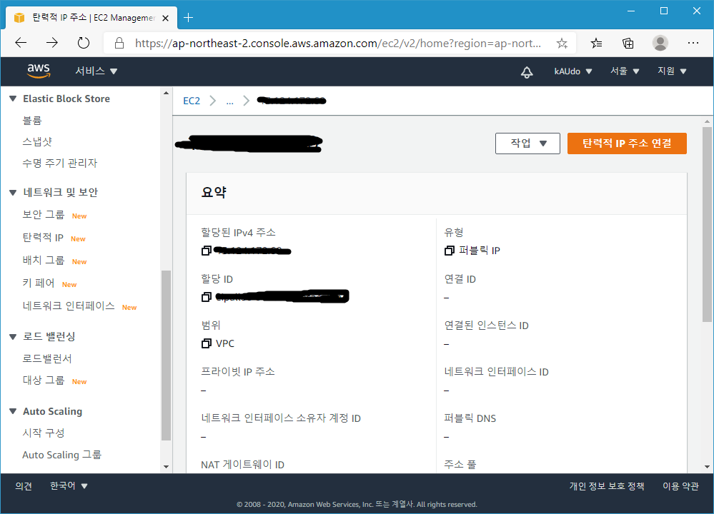 6. 탄력적 IP 주소 설정 > (아무것도 건드리지 않고) > 할당