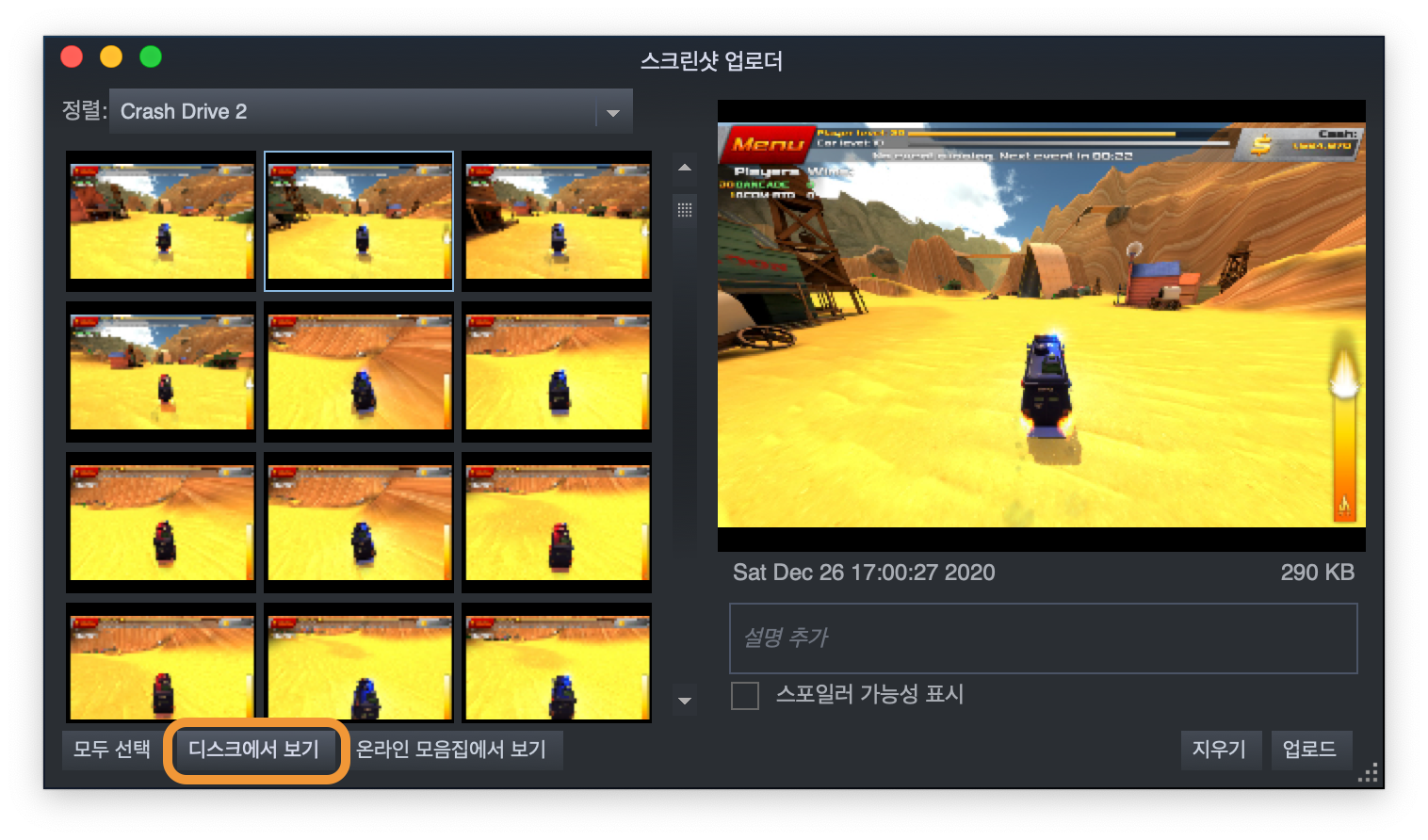 2. 스크린샷 업로더 > 정렬 > 게임 선택