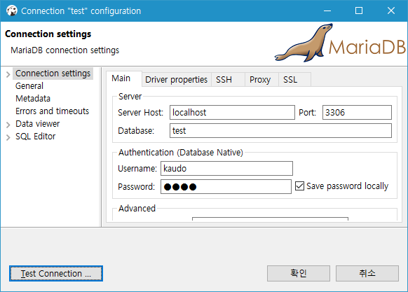 Host, Port, Database, Username, Password 입력