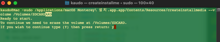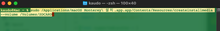 sudo /Applications/macOS Monterey\ 설치.app.app/Contents/Resources/createinstallmedia --volume /Volumes/SDCARD