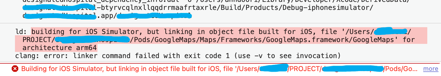 ld: building for iOS Simulator, but linking in object file built for iOS, file '/프로젝트경로/Pods/GoogleMaps/Maps/Frameworks/GoogleMaps.framework/GoogleMaps' for architecture arm64