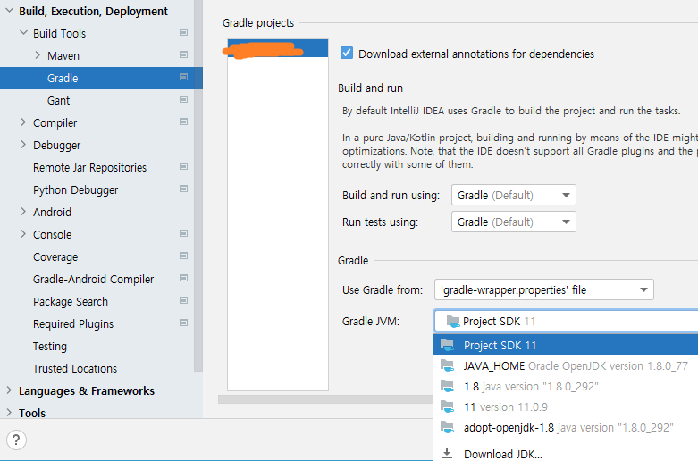 File > Settings > Build, Execution, Deployment > Build Tools > Gradle Gradle JVM: 11버전 선택 사용자마다 다를 수 있습니다. 전 JAVA_HOME(1.8.0_77)에서 Project SDK(11)로 변경했습니다.