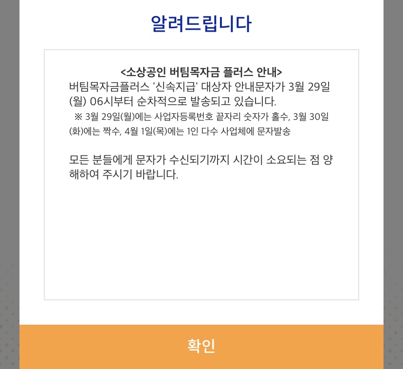 ※ 3월 29일(월)에는 사업자등록번호 끝자리 숫자가 홀수, 3월 30일(화)에는 짝수인 사업체만 신청이 가능하고 3월 31일(수)부터는 모두 신청 가능 * 예 : (3.29일) 123-56-0001(홀수)인 경우, (3.30일) 123-56-00000인(짝수)인 경우 (3.31일 이후) 사업자등록번호와 상관없이 모두 신청 가능 * 1인 다수사업체의 경우에는 4.1(목)부터 신청 가능