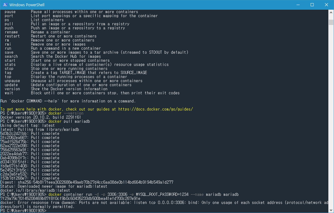 저같은경우에는 윈도우용 마리아디비를 이미 실행중이였는데 도커에서 마리아디비를 같은포트로 시작하려다가 발생했습니다.