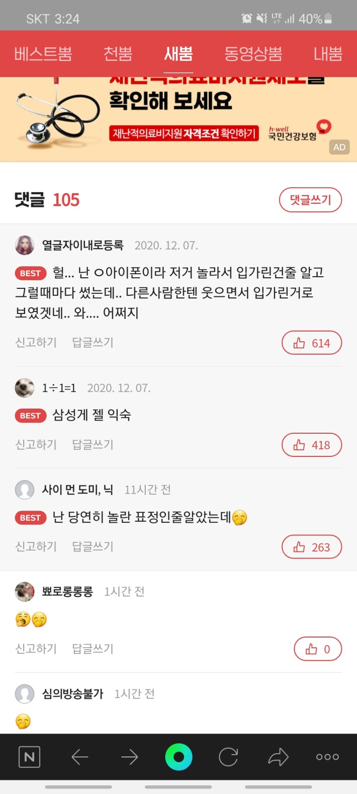 노랑둥이베댓끼리 예시 적절하네요ㅋㅋ 삼성폰 쓰는 사람들은 다 이렇게 봤을 것...