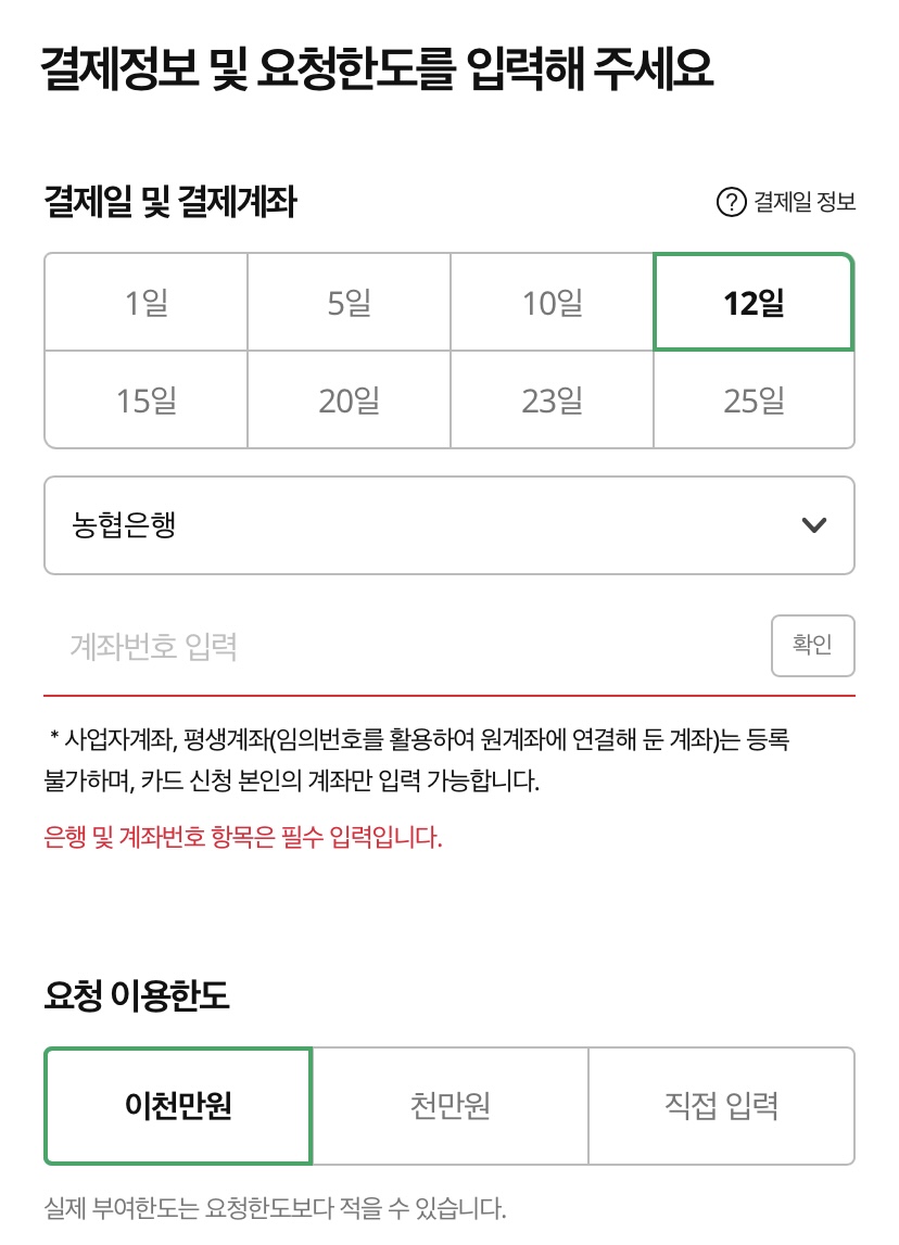 결제일 선택, 결제계좌 입력, 결제한도 선택