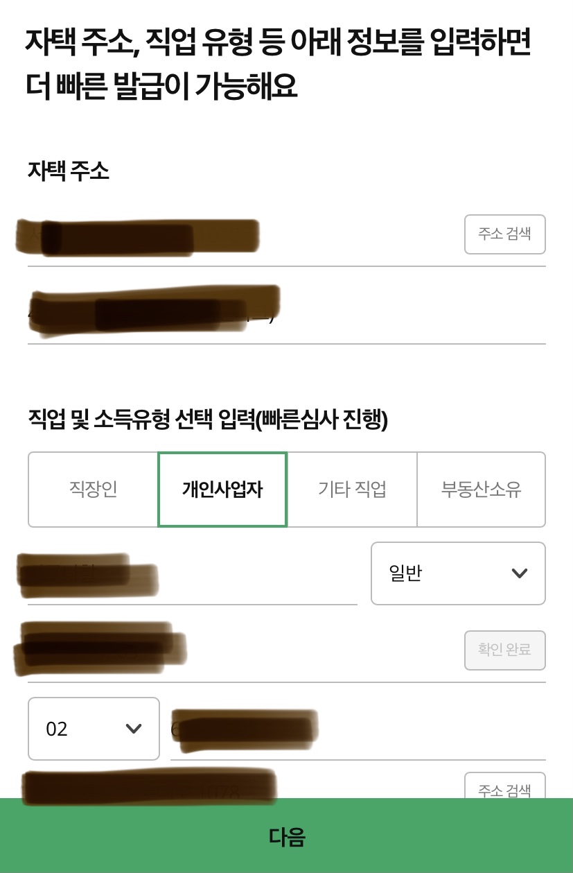 주소, 직업, 소득유형 입력