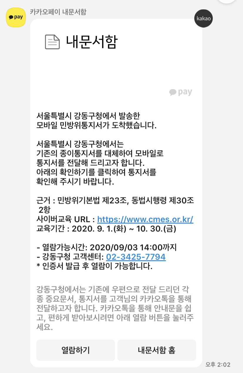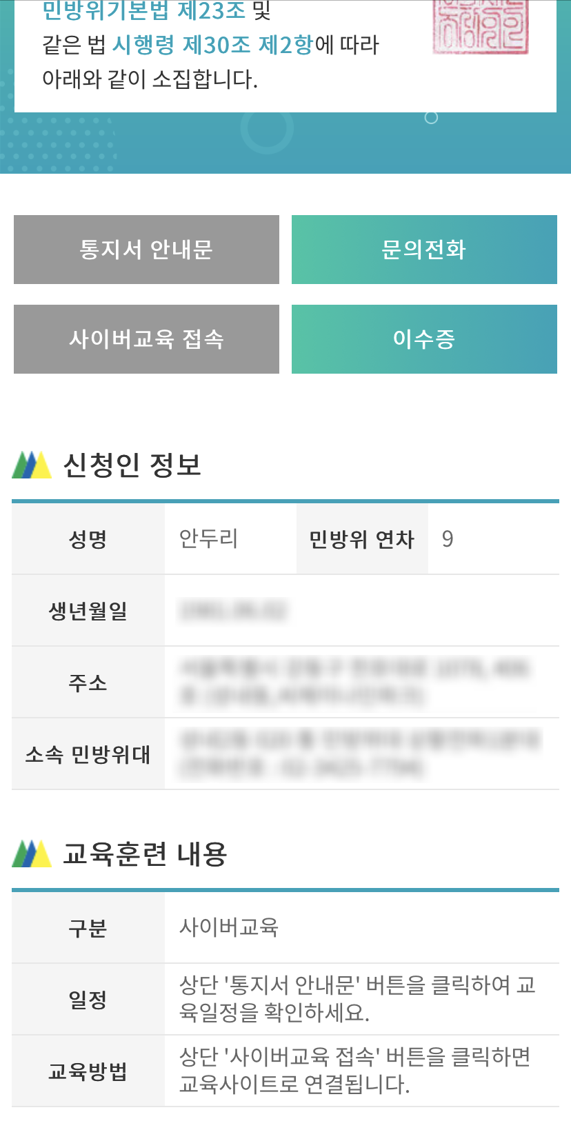 어느듯 가을이 되고 민방위 훈련 참가 통지서가 도착했습니다.