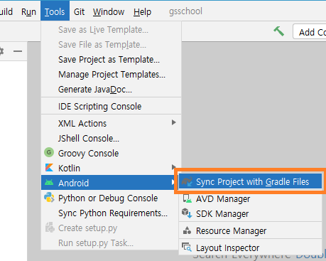 2. 메뉴 > Tools > Android > Sync Project with Gradle Files 선택