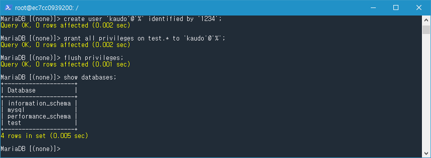 grant all privileges on test.* to 'kaudo'@'%';
