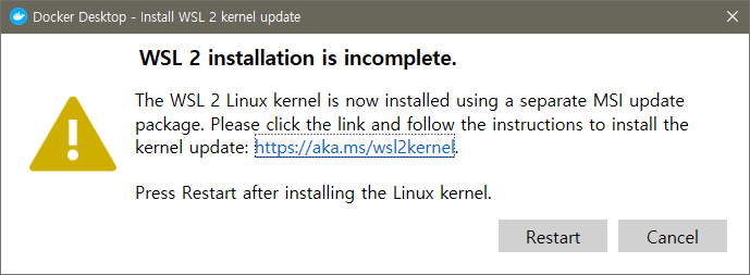 WSL 2 installation is incomplete, 윈도우10 도커 설치시 리눅스 커널 업데이트, Docker Linux Kernel Update on Windows 10