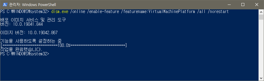 3. 가상 머신 플랫폼 기능 활성화 명령어 입력