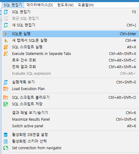 메뉴 > 윈도우 > 설정 > 편집기 > SQL 편집기 > SQL 실행