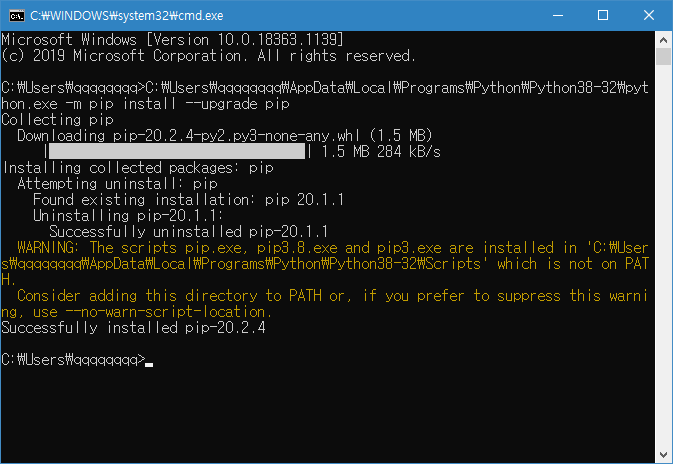 You should consider upgrading via the 'C:\Users\qqqqqqqq\AppData\Local\Programs\Python\Python38-32\python.exe -m pip install --upgrade pip' command.