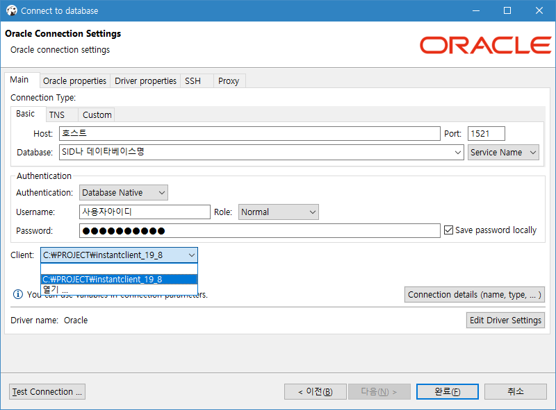 2. Oracle Connection Settings - 호스트, 데이타베이스(SID), 사용자명, 비밀번호, 클라이언트(instantclient경로)